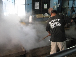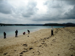 自分の分も含めてですが……(^^;) こちらは食べ物関連。 沖縄限定のハイチュウとか、ハイソフトとか、思わず手が伸びますね(*^0^*) 黒糖物、野菜チップ、海ぶどうなどなど、お酒のおつまみもいっぱい! 友達の赤ちゃんに、かわいいスタイ! 美ゅら海水族館で。タオルもかわいかった~。 そして、今人気らしい発掘おもちゃ、これも友達のお子様へ♪ オリオンビールのグラスは、自分用にも買っちゃいました。 そして、手前にあるのがシーサー! 首里城の門と小さな小さなシーサー、我が家の下駄箱の上に鎮座しております。 いろいろとおいしいものを探した今回の旅行ですが、 素朴でとってもおいしかったのが、この落雁。 抹茶と黒糖の2種類があります。 落雁といえば、小さいころお彼岸にお仏壇に備えられていました。 あの、着色料たっぷりな、派手な色の大きな菊の形したやつね。 みんなそんなにおいしくないっていうけど、粉物好きな私は、誰よりも食べてました。 そして、あんことか入ってないほうが好みなんだけど、 この落雁は少しだけ餡が入ってて、それもまたおいしいんだ~☆ 包んでもらう間、お店のおばあさんと少し話しましたが、 おばあさん:「どちらから? 内地よね」 パパ:「どこだと思います?」(←口挟んできた) おばあさん:「東京かしら」 パパ:「正解! 沖縄にはキレイな方が多いですね~」 私:「……」(←パパを睨む) 営業マンだったため、人とのコミュニケーションを積極的に取るパパは、 いつでも朝から晩までしゃべっています。(←家族は慣れてるけど、ウザ!) 沖縄でもお店のあらゆる女性に話しかけていたのでした~(*^-^) まあ、楽しいからいいんだけどね~♪ ♪楽しか~ったひと時が~今はもう過ぎてゆく~(←歳がばれる) あっという間に沖縄最終日になってしまいました。 今日は七草の日! ということで、ホテルの朝食にも七草粥がありました。 今日はちゃんとレストランで朝食だったので、オムレツもお魚も、目の前で焼いている出来立てを。 胃が疲れているので、すーっと染み込んでいきます。 この3日間では、いちばんキレイな海の朝なんじゃないかな。 しかし、北風が強いので海辺の散歩はなしで……。ホテルのプライベートビーチは、 上から見下ろして終了です。 今日は、いろいろ名物を購入する日ってことになっています。 で、工場見学とかできるところは行こう~と。 沖縄といえば、ざわわでもおなじみのサトウキビ。 この時期が収穫の真っ只中らしく、黒糖の工場へ行きました。 左は大きな釜で煮詰めているところ。冬なのにすっごい暑いです。夏はどうなってしまうのか! 固まってきたら、正方形に切って型からはずします(右) 工場の横には大きな売店があって、できたての黒糖をいただきました。 そのほか、いろんなものが試食できる~♪ 帰りにはお土産もいただきました。 黒糖と、サトウキビ。筋を取って、噛み付くと、甘い味。 なんか、パンダになった気分だ(*^-^) その後、明太子の工場があったので、立ち寄って、そこですごくおいしそうなお弁当を発見。 今日のお昼、コレにしようか~ってことで、お弁当を買い、次の目的地である、 塩の博物館にビューんと車を走らせ。 途中でお弁当食べられそうなところあったら立ち寄ろう~ってことになってたのですが、 高台に来るとものすごく風が強い!! お弁当とともに飛ばされそうだったので、食べるのはやめて、しばし最後の海を堪能。 どこから見ても海きれいだったなぁ。ぽわん☆ で、塩の博物館は、かなりシーズンオフだったようで、うちらしか客がいなく、 博物館は閉まってました。売店は空いてたので、塩好きな知り合いにお土産を購入。 結局、お弁当をどこで食べたかというと、移動した国際通りの近くにあった公園で。 部活帰りの高校生たち、じーっと見てましたね。 14:30過ぎてたので、こんな時間にお弁当広げてる人なんていなくて、 さらに、風もちょっと強くて、飛ばされそうになりながら。 でも、お弁当はすっごくおいしかったです。この幕の内で、680円! なんじゃー、その安さ! 沖縄本島は、思ったよりも広くて移動になかなか時間がかかりますが、 4日かけて、結構いろいろ回れたんじゃないかな~と思います。 国際通りではお土産を山ほど購入して。 きっと、探せばもっとおいしいものもあったと思うので、次に来ることがあれば、是非に~。 沖縄の人たち、本当に感じが良くて優しい人ばかりでした。 商売人は気が利く人が多いし、ホテルの従業員さんも親身だし、なんと言ってもみんな笑顔。 とっても癒された旅行でした。パワースポットに行かなくたって、英気は養えるものだよね。