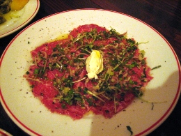月島に夏にオープンしたばかりの「月島ビストロ」ってとこ。HPなかったです。 ワイン好きな私たち、ツブ貝のガーリック炒め、和牛のカルパッチョなどをつまみに。 終わったのが遅かったので、2時間くらいでしたが、おいしいワインを飲んで、 仕事のブツクサもおおいに吐き出し、楽しく過ごしたのでした~♪ しかし、女子バナがないですね、私たち(^^;