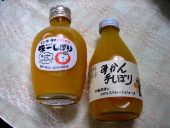 県庁の職員さんが、みかんジュースをくれました!! 「味一しぼり」と「みかん手しぼり」 帰り道で立寄ったサービスエリアでいただいたのだけど、 ほんとに“みかん”を食べてる感じのジュースでした! ホテルにもおろされているらしい、人気ジュース。ビンの形もかわいいです。 行くことがあれば、ぜひ~☆