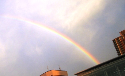 今日は行ってみました~ 感想は……いたって普通?! お店の雰囲気はとってもよかったのですが、 うーん、もう一度来るかときかれたら、特に……かな。 この日、ダブルレインボウが見えた日です! 駅のロータリーのところで、某宗教団体(←最近急に政治に進出してきた)の政治家が、 わけのわからないことを大声で演説してて、なぜか、みんなが写メを撮ってたんだよね。 最初、あんな団体にこんなに信者がいるのかと思って、すごく恐ろしくなったんだけど、 みんなのケータイの位置がずいぶん上だなあと思ったら、この虹を撮ってたのでした。 私も急いでカメラを出して、パチリとしてみたんだけど、残念ながらダブルは撮れず。 虹が消えたら、みんなとっととその場を離れたのでした。 あの政治家は、虹が出てたことも知らずに、 みんなが自分を撮っているものだと思って、かなりのご満悦状態。 とりあえず、自分の住んでる周りにあの宗教団体の信者は少なそうで、ホットしましたとさ☆