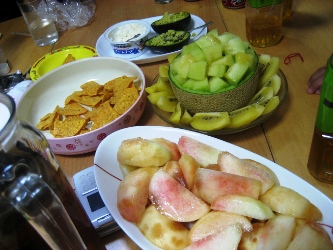 で、友人宅からは、まん前に花火が見える!! ってことで、みんなで集まったのでございます~~♪ 花火もきれいだったけど、やっぱりみんなと集まっての会合はたまらんのう~☆ デザートになったとこで、そういや写真とってないやって思い出し、パチリと。 フルーツ、すごくおいしかった!! たくさん用意してくれたみなさま、本当にありがとう~! また集まろうね。 あ、花火? 花火の詳細は、友人「ひろよし日記」でチェックしてね!!当日をリンクしましたから~ (↑他力本願な私)