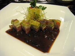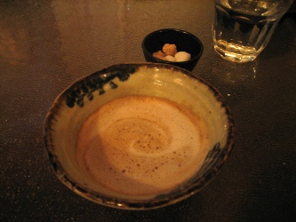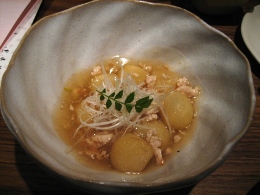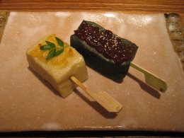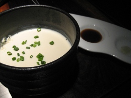 で、お仕事関係の忘年会では、今日が最終です。 私が行きたかったお店「KUROGANE」にしていただいたので、写真撮りました~! えーっと、以前に取材したときに、近江牛がとってもとってもリーズナブルでおいしそうだったのです。 で、もちろん、近江牛の鉄板焼きも頼んだのだけど、 すっかり写真撮ってません(滝汗 そういえば、飲んだくれてて、後輩君が焼いてくれてたっけなぁ。 みんなの焼き方の好みまでしっかりきいて、焼いてくれてたなぁ。 ハンバーガーみたいにするお好み焼きも名物で、頼んで、とってもおいしかったのだけど、 そういえば、私は飲んだくれてて、後輩君がキチンと人数分に分けて焼いてくれてたっけなぁ。 いつもすまないねぇ。 というわけで、写真は乾杯と同時に食べたお豆腐とサーモン親子の湯葉巻です。 一品料理もなかなかおいしかったです!!