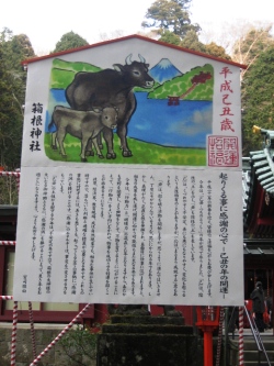 ということで、今年も「箱根神社」へ行ってまいりました。 いつ来ても、厳か&神秘的な空気が流れてます。山の中にあるからかな。 もう七草の日だというのに、お参りの人たちで大賑わいでした。 年女のわたくし、この丑年に関する説明に見入ってしまいました。 前来たときみたいに注連縄はなかったけど、じっくり読んで、神様にお願い事を。 そして、おみくじを引いたところ、やったね、大吉です!! ガッツポーズする私を冷ややかな目で見ている巫女さんたち……すみません。 お守りはダルマさんが入っていました。 七転び八起きで、何がおきても起き上がる力を授けてくれるとか。 さっそくお財布に大事に入れました。 今年もいいことがたくさんありますように。