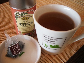 「三國屋善五郎」は、日本茶を中心にいろんなフレーバーのお茶が置いてあります。 で、このあいだルピシアで日本茶をいろいろ買い込んだので、 今日は久しぶりにジャスミン茶を手にしました。 ティーバッグなので、簡単に淹れちゃいます。 缶のふたを開けた瞬間から、ジャスミンの香り! ティーバッグだけど、しっかりと香ってます。パッケージもかわいいからギフトにもオススメ。 フタつきのマグカップだと、使用済みのティーバッグを置いたり(写真は使用前ですが)、 ちょっとしたお茶請けをのせたりと、ひとり分でも活躍しますね~。