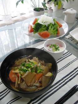 お子様は2歳6ヶ月。もう名前で呼んでくれるようになりました。 激カワなんですけど!! たまらんのぉ。 そして、いつものようにママのとーってもおいしいランチをいただきながら。 産直の野菜類に、特製スープがおいしいおうどん。 このスープが、ほんとにやみつきになるおいしさ!! 野菜も新鮮だから、かなりいい出汁が出ています。 いつもいつも、本当にご馳走様です。ありがとう! お子様、グルメに育つに違いなし!! 将来、一緒に食べ歩きしてくれるかな~☆
