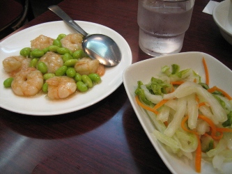楽しく仕事しています。社長には娘のようにかわいがってもらったので、 恩返ししないとね~。ということで、晩ごはんもご馳走になっております。(←どこが恩返し?!) 遅くなったので、近所の中華でささっと。 小皿料理がたくさんあるところなので、2人でもいろんな種類が食べられるのがいい感じです。 ひとつひとつがまたおいしかったし!! セロリとキャベツの中華風浅漬け、エビと枝豆の炒めもの、空芯菜の炒めもの、などなど。 「おまえ、痩せたからな~。太れ!」って言われました。 会社にいた頃より、まだ太っているのに、やっぱり若さには勝てないってことかな。 でも、おいしくいただきました♪