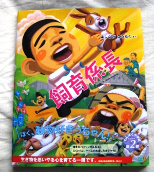『飼育係長』 作&絵:よしながこうたく 発売元:長崎出版 動物園に遠足に出かけた1年3組。 帰り道、まさおくんのリュックサックにとある動物が入り込んでいて、学校で飼うことに。 そして、夏休みが終わる頃、その動物は巨大に成長していたのでした。 気がつくと、小屋からいなくなっていて。どうなる? まさおくん! いなくなった動物と、感動の再会シーンでは大粒の涙。かわいいのだ~。 博多弁で読むと、また違った味わいです。 ちなみに、給食番長のほうにはすごろく、こちらには福笑のおまけつきです。 続編は「あいさつ団長」っていうのが控えてます~。発売までもう少し。楽しみです!