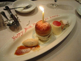 とりあえず、東京駅で待ち合わせて、黒塀横町でビールを飲み、赤羽へ移動。 雨が降ってて寒かったので、モツ焼きでも食べてあったまろう~ということに。 赤羽って、ちょっと路地に入ると、思わず立ち寄りたくなっちゃうようなお店がズラリなんです。 赤提灯大好きな私、このお店もいい感じに庶民的でした~♪ やわらかなモツで、矯正している私でも大丈夫! 右の焼きおにぎり茶漬け、せっかく頼んだのに、ほとんど世帯主が食べちゃった。 「オレ、焼きおにぎりあんまり好きじゃないんだよね~」と言いながら(怒 どうやら、やっぱり米は好きらしい。おいしいし~。 私のお誕生日だったということで、 何度か連れて行っていただいたバーへ移動! フレッシュな桃とモエを使った、すごくおいしいベリーニで乾杯し、 寒かったから、アイリッシュコーヒーを。これが、最高においしかった~! 豆はマンデリンで、手で挽く所から始まります。ほんと、おいしい。 お祝いしていただいて、ありがとうございました! うれしかったでーす! 今度は、世帯主ぬきでゆっくりデートしましょうね~♪