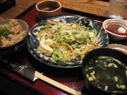 今日は、私の好きなお店でランチを! ってことになったので、遠慮なく。 沖縄料理の「龍潭」にしました。 いろいろセットのなかからゴーヤチャンプルーを。 ジューシー(炊き込みご飯)と一緒に、 またまたガッツリなランチでした。美味~♪