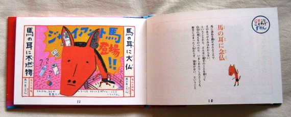 『にせニセことわざずかん』 作&絵:荒井良二 発売元:のら書店 日本のことわざを、面白おかしく言い換えた遊び心たっぷりの絵本です。 空耳アワー的な要素がたっぷり!! ただ、ダジャレ満載ですけどね。面白いです。 たとえば「馬の耳に念仏」→「馬の耳に大仏」「馬の耳に不燃物」とか。 そんで、私の好きな荒井良二の絵なので、何時間も見ちゃってるのでした。 中学生くらいならことわざもたくさん習ってるし、意味わかって面白いかも。 小さい子は、絵をみて楽しむ感じかな~。