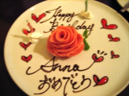 先月、ミュージカルがんばったパンマイスターちゃん、今日がお誕生日当日! ということで、大雨の中、張り切って集まりましたよ~。 お店はまたまた独断と偏見で「チェント・アーニ」(渋谷店)に決定! 左は名物のライスコロッケです。すごくでかいの!! 6人でちょうどいい大きさでした。 ほかにもたっぷり頼んで、たっぷり飲んで、いい気分で酔っ払ってお祝いし、 右のデザートまでしっかりと~♪ 私はカフェラテとティラミス。 おいしかったんだけど、残念だったのがスタッフの一人ね。メガネかけた男の人。 なんか、えらそうなんだもん。どう見てもまだ私たちより若造っぽいし、 パンマイスターちゃん&旦那様(フレンチのシェフ)が料理について質問すると、 “素人のクセにそんなことまで聞くなよ” 的なオーラを出しながら、すっごく感じ悪いの! こっちにはプロが2人もいるんだぞ~!(と、素人の私が遠吠え) つくづく、接客って大事よねって思います。もっといい人材入れたほうがいいよ~。(余計なお世話) ま、でも、おめでたい日なので♪ アセロラアイスクリーム(ジェラートかな?)で 作ったバースデープレートでお祝い! おめでとう~♪ これからも末永く仲良く、よろしくね☆☆ メンバーのみなさま、いつもありがとう!!