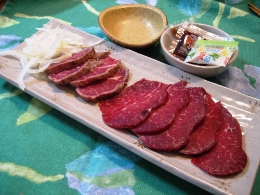 メールが来て、「あの馬刺しはマジですごくうまいから、説明どおりに解凍してね!」 もう、解凍待ってる間からワクワク~☆ お酒の準備もバッチリです。 右は刺身、左はたたきです。 刺身はわさびかしょうが醤油で。 たたきはおろしポン酢で。 こーれーがー!!!!! 九州で「おいしいよ」って言われて食べたものより、 数段うまかった!!! 感動~☆ ありがとね、エツリン♪(←また私信)