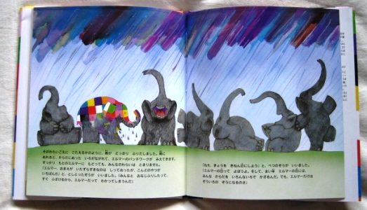 『ぞうのエルマー』 作&絵:デビッド・マッキー 訳:きたむらさとし 発売元:BL出版 最近は、キャラグッズとなってソニプラなどで販売されているので、 見たことのある人も多いと思います! カラフルなゾウは、1回見たら忘れられないインパクトですよね。 これ、パッチワークのゾウなんですが。 みんなと同じ色になりたくて、自分を灰色に塗ったエルマー。 雨が降って、パッチワーク色に戻っちゃっても、みんなで笑顔のゾウたち。 エルマーが自分をゾウ色に塗ったことで、最後には素敵な習慣が出来上がるんだけど、 それがなんともいえず、すっごくうれしい気持ちになります。 このシリーズはたったの5年で14作も発売されました。 全部ほしいわあ。 やっと原稿も終わって(一部)、今日はゆっくりできる~!
