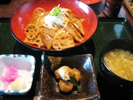 休み前だからしょうがないとはいえ、疲れます。 なので、ランチは和食で元気を出すことに! お店の名前失念しちゃったけど、 ランチのときはお味噌汁が飲み放題。 赤・白・佐渡の3種類の味噌汁があります。 私は佐渡味噌にする。 飲み放題といっても、1杯で充分だったけど。 アナゴとキンピラ丼でした。おいしかった!