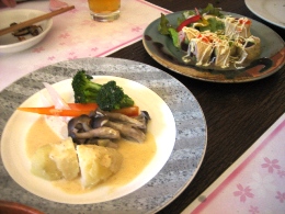 近所に少し前に自然食のお店ができたので、優雅にいってまいりました~。 とはいえ、マダームな主婦達が子連れで山ほど! バイキング形式なのですが、お店が案外狭くて、 結局30分待つことに。 まあ、おいしいものを食べるためだし、 4人揃えば30分なんてあっという間だし~。 で、おいしくいただいてきました。 それにしても、携帯の写真てダメだね。 ランチの後は、お友達のおうちに移動してお茶タイム! wii初体験させてもらっちゃいました~♪ 昔からゲームが苦手でほとんどやらない私、子供達にも完敗で、気がつけば急性wii炎に……(泣 大人気なく、1勝するまでリモコンを振り回していたのでした。 でも、楽しかったな~! wiiスポーツ! またお邪魔させてね~☆