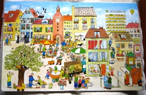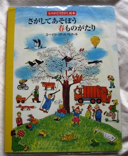 世帯主がレジで清算しているときに、ささっともって行きました♪ 『さがしてあそぼう春ものがたり』 作&絵:ロートラウト・スザンネ・ベルナー 発売元:ひくまの出版 発行:2005年12月 この絵本には物語がありません。 舞台はドイツで、いろいろな人がページをめくるたびにさまざまな出来事に遭遇します。 そのいろいろな人たちを追いかけながら、自分で話を作っていくんです。 登場人物は人も動物もいます。 版形が大きくて(B4変形)、細かいのにわかりやすい絵がGOOD! 何通りものお話が作れるので、小学校低学年くらいから、 お母さんと一緒にお話を作れるのではないかと思います。 これは春バージョンですが、四季4部作あるので、残りの3つもそろえたいなあ。