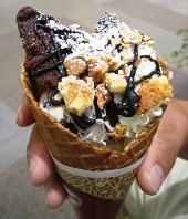 それはそれは恐ろしいカロリーだからだそうです……。 取材のときに小耳に挟んだのですが、そんなことでは食べるのやめないよ~☆ だって、おいしいんだもん♪ それに、私は撮影のときにハーゲンダッツ4つ食べたことがある怖いもの知らずです。 しかも、クリスピーサンドね。どんだけのカロリー??!! で、今日は~。 世帯主が抹茶白玉、私はチョコブラウニーも入った長い名前のサンデー。 世帯主が持ってくれてたので、ちょっとゴツゴツの手が写っちゃってすみません。 もりもりといただいちゃいました! むふふ~☆ カロリーとった分は、一生懸命歩きましたよ! ま、気やすめにしかならないけどね(泣