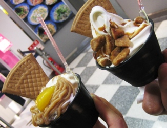 いったのは「マーブルプレミアムソフト」です。 生チョコレートを使っているのがポイントなんだけど、 最後は自分達で好きなフレーバーを注文しちゃいました。 初めて食べるときは「生チョコスペシャル」をぜひ! 私は右側の「キャラメルクリーム」を注文。濃厚でやわらかなソフトはもちろん、 あのスナイダーズのキャラメル味が乗ってて、塩加減がいい塩梅に! スタッフちゃんはモンブランを頼んでいました(左)。 ちゃんとモンブランの味がしたよ~。次回は何を食べようか、考え中です。