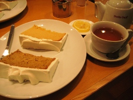 飲んだくれていたので、今日はくったくたでした~。 お昼前に友人達と別れて、いそいそと選挙へ。そして、スーパーで買い物したら、 もう体力の限界。で、家でごろごろしていました。 そんなこんなで写真がないので、 この間久しぶりに食べた「ダッキーダック」の シフォンケーキをアップします。 最近は“よくばり2種類セット”てのがあるのね。 メープルシフォンと紅茶シフォンを選ぶ。 コーヒーはあんまりおいしくないダッキーダックですが(だから紅茶を注文)、 ケーキは結構好きなんです。しっとりしフォンでおいしかった!
