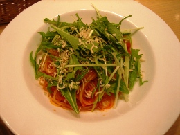 なんとなく「カフェ・ラミル」が目に入ってきました。 一緒にいたスタッフ君が、「ふられた彼女とよくきたカフェです」としんみり。 私はといえば、カフェ・ラミルは学生時代からの御用達で、いろんな人たちと来たから、 なんの感慨もなし。懐かしい気分になって、半ば強引にココに決定したのでした。 ランチ代を出すのはスタッフ君の会社なのに……。いつもすまないねえ。 カフェは御用達だったけど、ランチに利用したことはなくて、フードははじめてかも! パスタランチにしてみました。これ、サラダじゃなくてパスタね。 じゃこと水菜のトマトソースカッペリーニでした。 食後はカフェラテをいただく。普段は結構な値段のコーヒーも、 ランチセットだとお得なのがいいですね。スチームミルクもおいしかったです。 パスタはまだまだ改善の余地アリアリかなあ。ユニマットグループ、頑張れ!