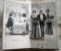 『お行儀の悪い世紀末』 作:ピーター・セイモア 絵:ボルジェ・スペンソン 訳:中村公男 発売元:大日本絵画 1993年出版 ポケット辞書サイズで、なおかつ「ポップアップ絵本」と書いてあったので、 ろくに確かめもせずに購入してしまった絵本です。出会いだったのかな? 何がお行儀が悪いのかというと……。 レストランでの優雅なお作法(左) 社交界でのエチケット(右) 仕掛けを引っ張ると…… テーブルの下で足触ってる!(左) メイドさんのお尻なでてる!(右) *そして女性も嫌がってない! というように…… 夜のひと時、ゆっくりバスタブに浸かる貴婦人。 仕掛けを引っ張ると…… オッサンも一緒に入ってる!! 文章には 「いつどんなときでも紳士たるもの、 助けの手を差し伸べようと心がけていたのです」 ……ふうん。 そんな感じで、エロいオッサンとおばさんが繰り広げる、 ビクトリア王朝の頃の世紀末なのでした。 ちなみに、この出版社はポップアップ絵本をたくさん出しているのですが、 サブタイトルには「子供の心を開く絵画ポップアップ」とあります。 このポップアップ絵本で、子供の心を開く……??