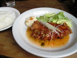 今日は取材でした。なのでランチのアップです。 今日、20度まで上がるって言ってたけど、寒いじゃないか!! お店選ぶのもめんどくさくなり、何度も行っているお店でランチに。 スタッフちゃんの「揚げ物と野菜が食べたい」という言葉につられて、 みんなで日替わりの「鶏唐揚げチリソースがけ」を注文。 出てきたら……。1枚揚げですか!! 端っこが揚がりすぎてましたよ~。 パリパリじゃなくて、バリバリでしたよ~。味は良かっただけに、ちょっと残念。